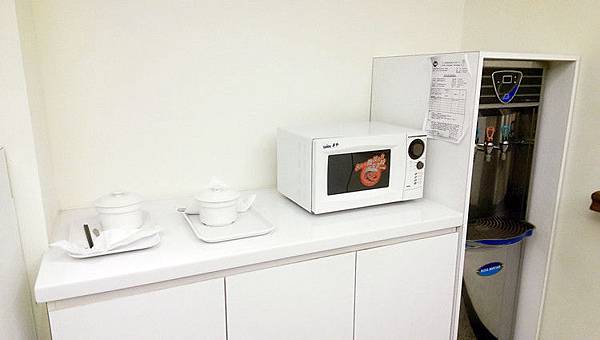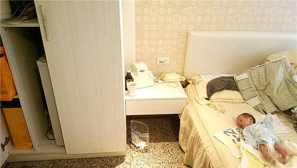 床鋪的右側是衣櫃,冰箱則是一起放在裡面,吹風機和洗衣籃這邊都有提供,所以就不用再另外從家裡帶來。每個房間內也都有提供奶瓶消毒鍋,還有保溫瓶可以裝他們煮的養生茶,愛維納斯產後護理之家的養生茶喝起來清香清香的,我還滿喜歡的,口味方也會做輪替,不用怕喝膩,喝完還可以再打電話請他們送。
