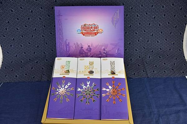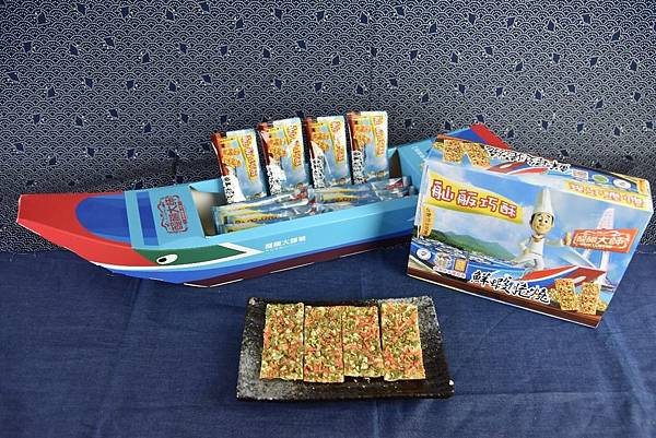 哇!這個船造型的禮盒好特別喔!這是淡水的特色船舢船,是只有淡水才有的文化特色,色彩鮮豔又富有文化內涵的禮盒裡面裝的是什麼呢?答案就是──舢舨巧酥!醍醐大師的舢舨巧酥口味豐富,每片輕薄酥脆,香濃的原燒口感,丁香脆燒口味香味濃厚,上面鋪滿滿滿蔥香、魚干、杏仁等等,是大人嚐鮮,小孩零嘴的最佳年節伴手禮。