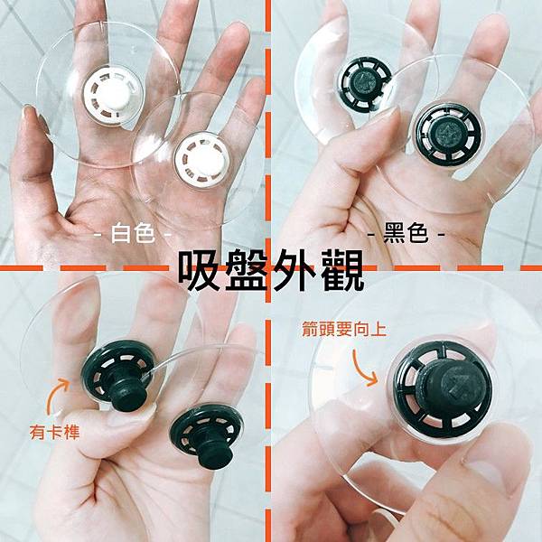 除此之外吸盤上有小巧思!因為都是用卡榫的方式安裝,所以凸出來的有個凹槽,上面還印有箭頭,吸牆的時候箭頭都要朝上唷~很貼心的設計呢
